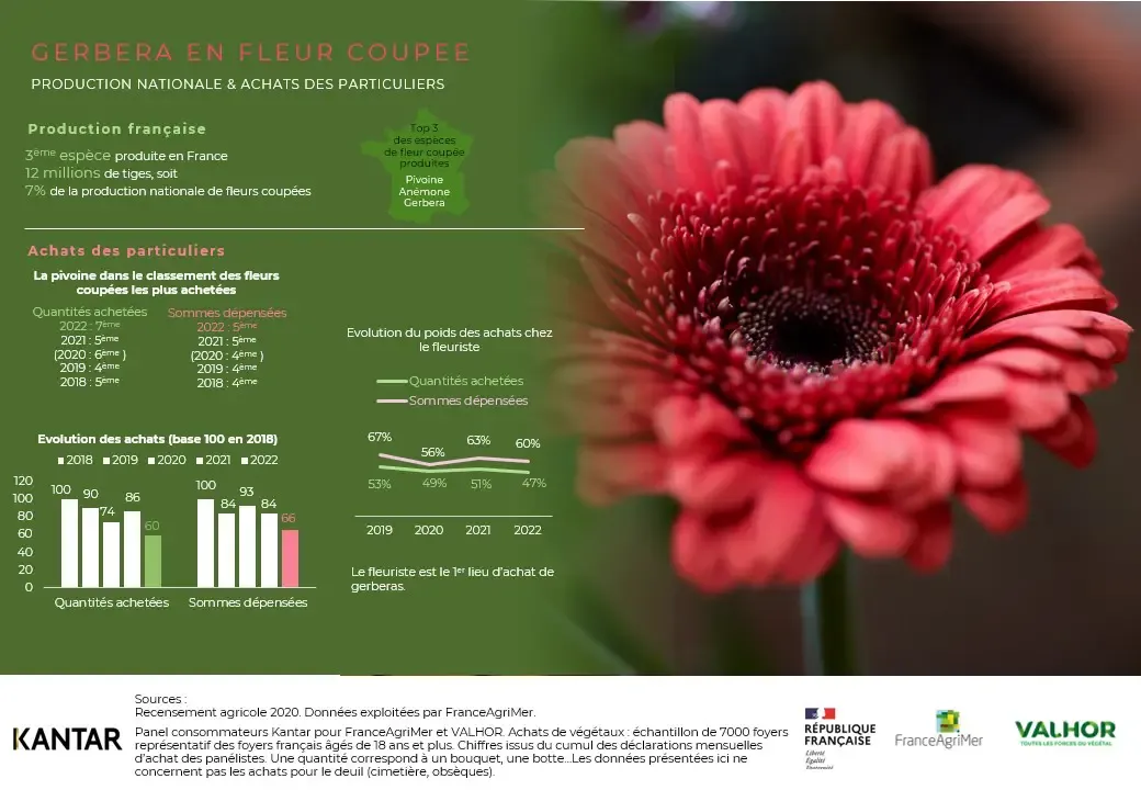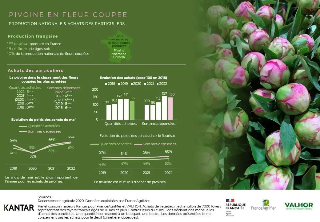 Côté consommation, la pivoine était en 2022 la 5ᵉ fleur la plus achetée. Elle se positionne en 4ᵉ place en poids des dépenses. Si l’année 2022 a été marquée par des achats plus faibles des particuliers en pivoines, son niveau reste supérieur à celui de 2018 et 2019.